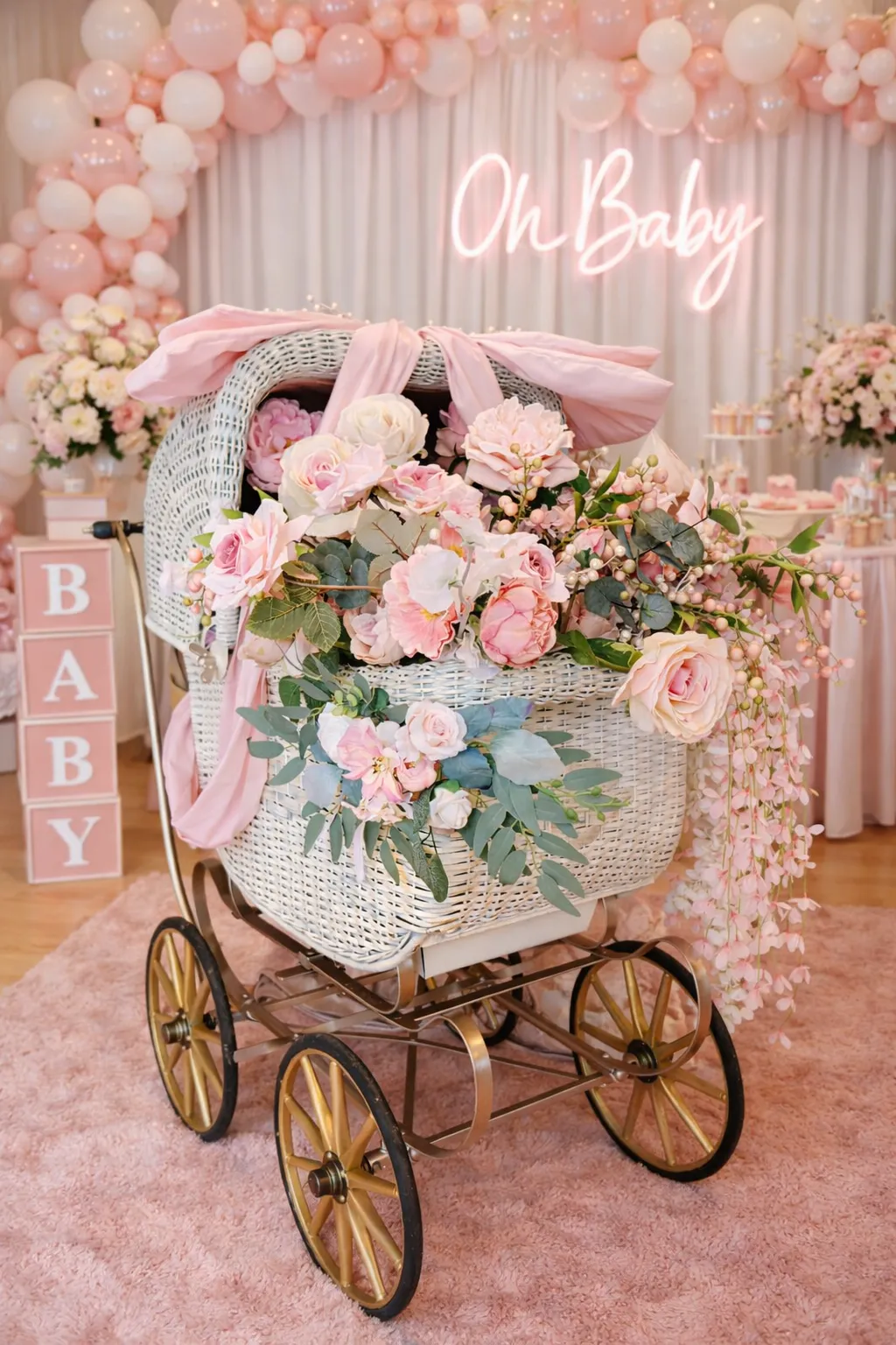 For baby showers, we offer one-of-a-kind antique vintage baby carriages that have been restored by hand. These timeless pieces can be filled with florals from any of our collections, or we can discuss custom color palettes to match your theme. They make stunning focal points for gifts, photos, and welcoming displays.